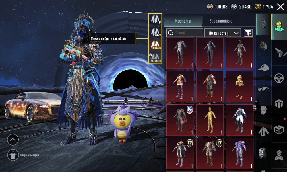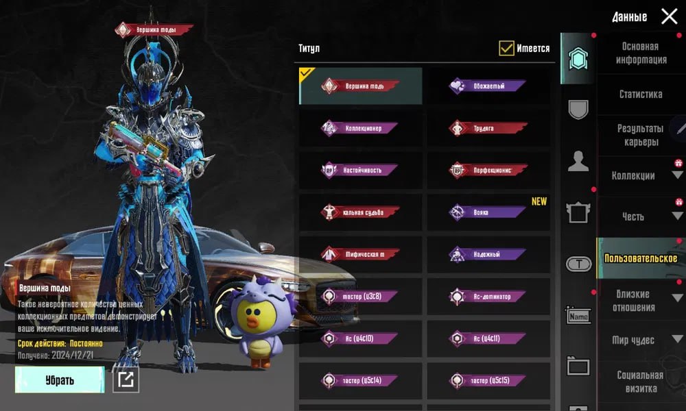 В наличии костюм-Х 3-го уровня , 2 Золотых костюма , 3 мумии , два спорткара , фулл сэт «Ледник» , М416 - 3 штуки фулл , открыт счётчик убийств. Куча мификов, скинов на оружие и многое другое.