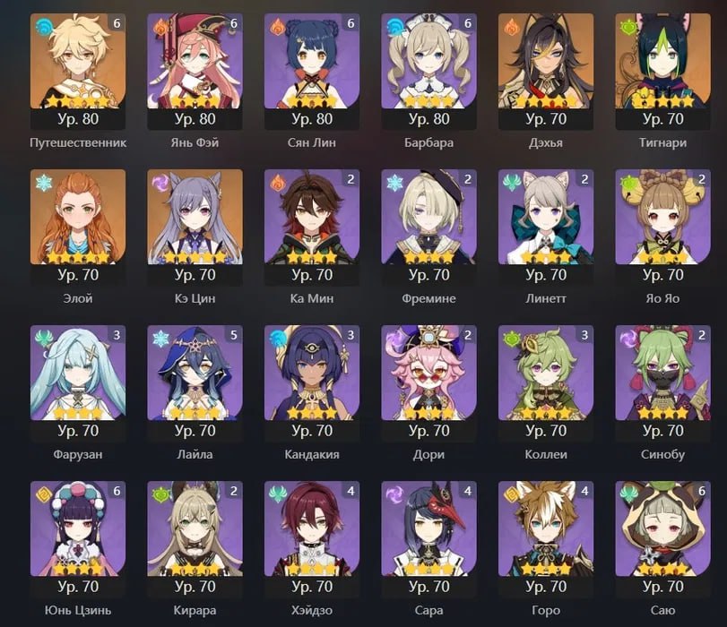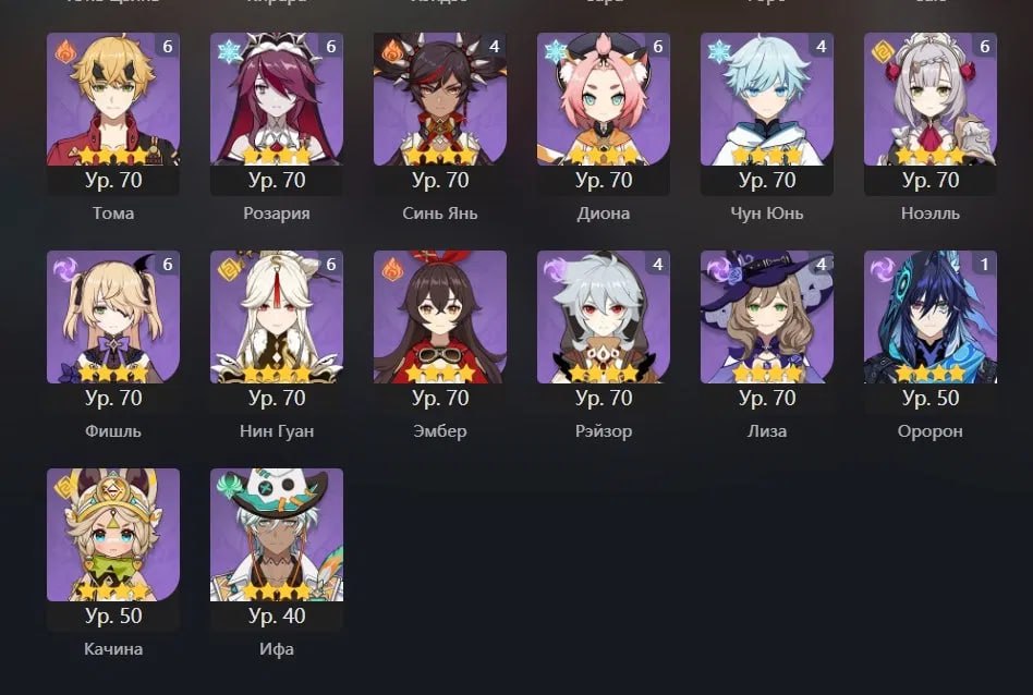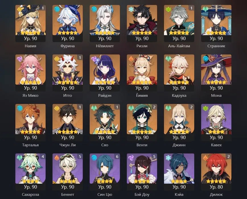 Венти (C2), Джин (C2), Дилюк (C2), Навия (C1), Альхайтам (C1), Итто (C1), Чжун Ли (C1), Сяо (C1) и другие.